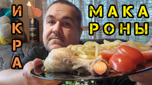 Обжор не мукбанг - вареная курица с макаронами, маринованный лук, кабачковая икра