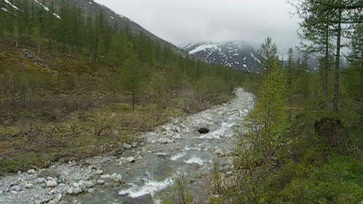 Среднее течение р. Мал. Вангыр. Ниже устья руч. Белка начинается лесная зона, основа древесной растительности - лиственница и ива.