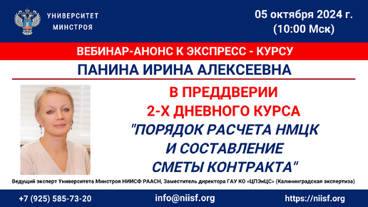ВИДЕО. Панина И.А. Вебинар. В преддверии 2-х дневного курса "Порядок расчета НМЦК и составление сметы контракта"