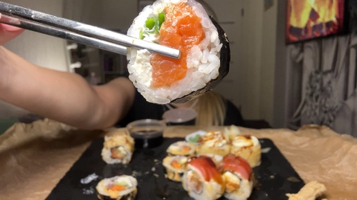 Мукбанг/ Роллы🍣Суши🍤много рыбы/ Тест