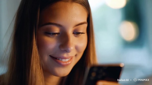Промпт для видео: лицо красивой девушки с улыбкой смотрит в телефон