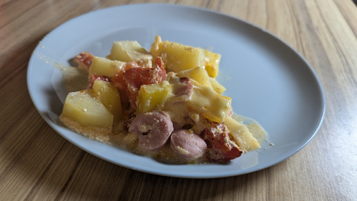 Картофель с сосисками и помидорами в духовке