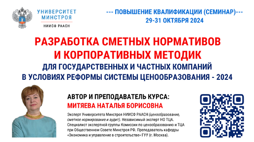 АНОНС. Митяева Н.Б. Разработка сметных нормативов и корпоративных методик для государственных и частных компаний в условиях реформы