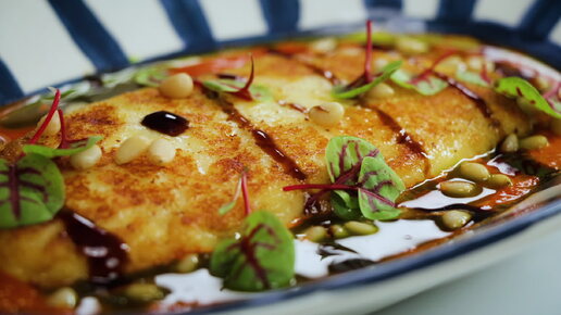 Рецепт - жареный халуми с кремом из печеного перца и мятным маслом