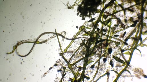 Нематода (круглый червь) пресноводная в капле воды из аквариума под микроскопом Ultra HD 4K
