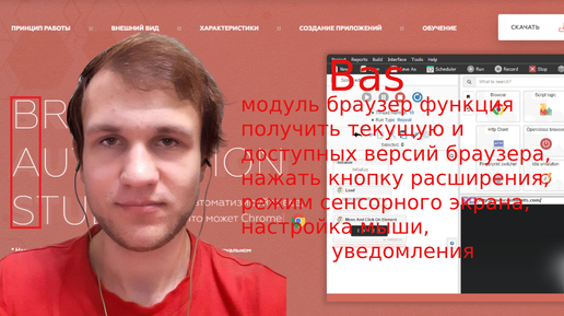 BAS получить текущую и доступных версий браузера, нажать кнопку расширения, режим сенсорного экрана, настройка мыши, уведомления