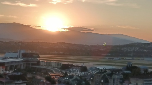 Восход солнца над горами за аэропортом Сочи. Виды на аэропорт. Взлёт самолёта. 2024 год, середина осени...