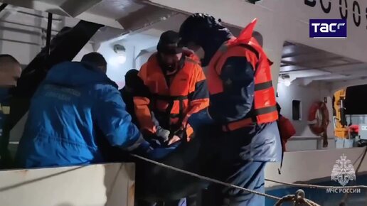Спасатели МЧС России транспортируют спасенного рыбака, два месяца дрейфовавшего в Охотском море на катамаране