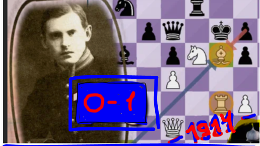 Александр Алехин (черный цвет фигур) круто выигрывает у Олдржиха Дураса в испанской партии, в-т Лутикова (Мангейм, 1914, 0-1)