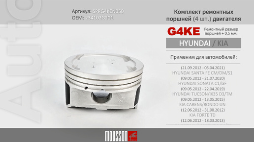 Комплект ремонтных поршней + 0,5 мм. (4 шт.) двигателя G4KE. Артикул: SPRG4KEN050. ОЕМ: 234102G201