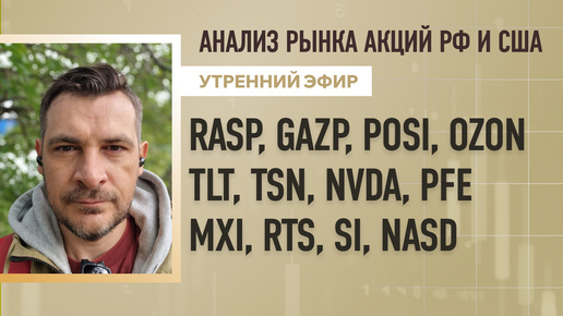 Анализ рынка акций РФ и США/ RASP, GAZP, POSI, OZONTLT, TSN, NVDA, PFE/ MXI, RTS, Si, NASD