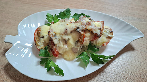 КУРИНАЯ грудка, запечённая с СУЛУГУНИ, Помидорами и Грибами. Рецепт сытного блюда на ужин. ГРУДКА остаётся очень нежной и СОЧНОЙ!