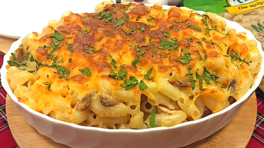 Запеканка из макарон с грибами, сливочным соусом и сыром