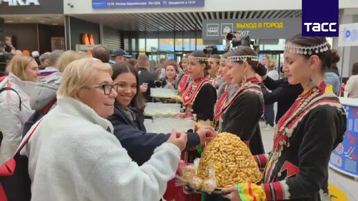Кумысом и чак-чаком встретили в Уфе олимпийскую команду России, прибывшую на форум