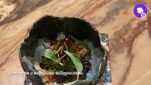 Осьминог с черными китайским грибами, с соусом тамариндо, бататом и водорослями в новом сете «Мир Оллуко» в перуанском реcторане Olluco