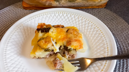 Запеканка с солеными огурчиками и мясным фаршем, очень вкусный обед на скорую руку