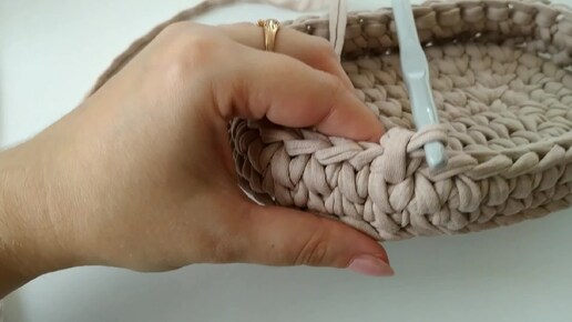 Мастер класс "Люлька для куклы 15 см из трикотажной пряжи Бисквит". Вяжу второй ряд стенок люльки, делаю соединение ряда с нюансом.