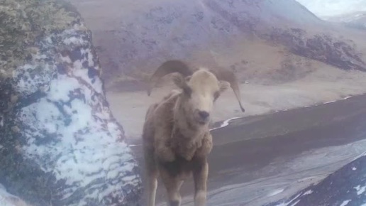 Аргали нюхает фотоловушку.