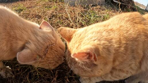 Деревенские коты впервые пробуют корм. Бодаются