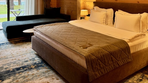 Номер категории Делюкс в Grand Chalet Altay: 34 м2 с кровать 200х200, выход на террасу с мебелью. В панорамные окна — вид на Катунь и горы