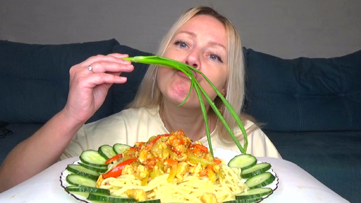 Мукбанг спагетти , курица тушеная с овощами, лукИ репка и зеленый, огуречики). еда