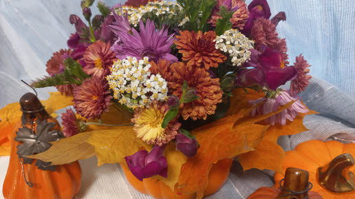 Яркий букетик в кашпо-тыкве из последних участников осеннего цветника!!!