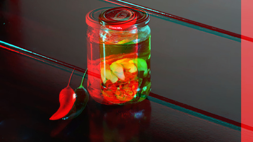 3D stereo red-cyan Консервированный острый перец в масле и заправка острое чесночное масло