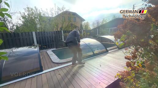 Павильон для бассейна модель FLAIR. Размеры 6,5х4,0х0,85м. Цвет профиля антрацит. Тонированный монолитный поликарбонат.