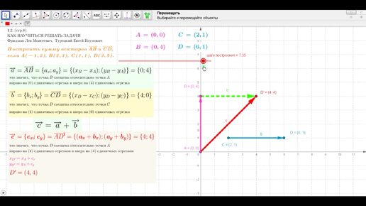 !*! Фридман Л.В.- КАК НАУЧИТЬСЯ РЕШАТЬ ЗАДАЧИ - № 1.2 стр. 8 - Построить сумму векторов AB и CD, если А ( — 1,2), В (2,3), С (1,1), D(3,5).