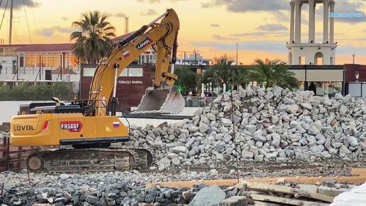 Реконструкция набережной в Сочи. Работа тяжелой техники по созданию новых волноломов.