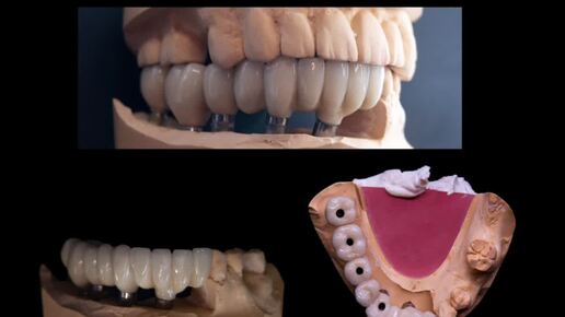Металлокерамические коронки, нижняя челюсть, на имплантатах в этапах.