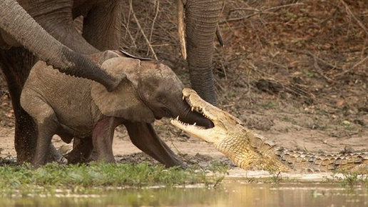 Крокодил напал на слонёнка. Малышу пришёл бы конец, но тут вмешался старый слон
