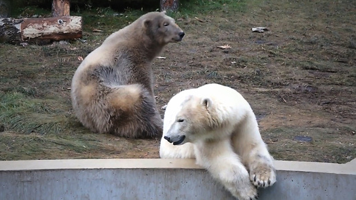 Один белый медвежонок, а другой цвета "поздней осени" гуляют и развлекаются в вольере.