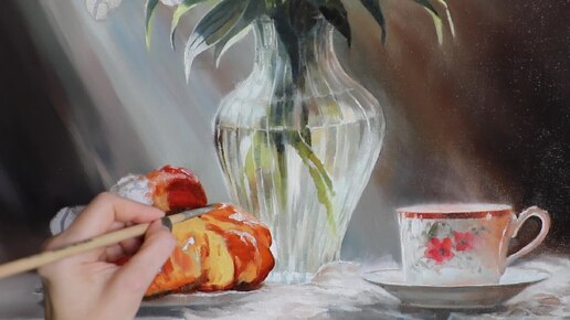 Процесс из мастерской художника: пишу свежую выпечку маслом на холсте, фрагмент натюрморта.