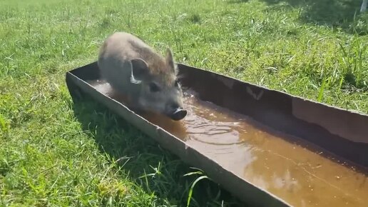 Смешное. Веселая свинья наслаждается летним днем. Плавает в бассейне и играет в футбол