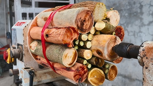 Взял стволы разных пород деревьев, напилил пилой кругляк, собрал в кучу и крутанул на станке.