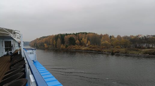 Видеозарисовка 28 октября 2024 года с борта идущего по воде круизного теплохода. Вид на деревья, речку, небо. Встречаем осень на реке!