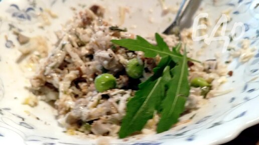 Грибной салат с ореховыми нотками, рукколой и свежим зеленым горошком - «Элегантность»