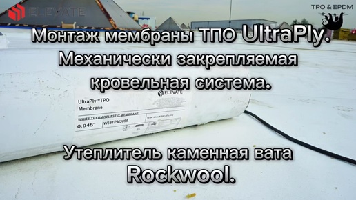 Монтаж мембраны ТПО UltraPly от компании Firestone/ELEVATE, механически закрепляемая кровельная система, по каменной вате Rockwool.