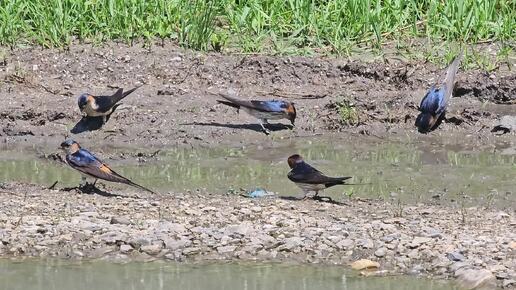 Рыжепоясничные ласточки собирают грязь для гнёзд