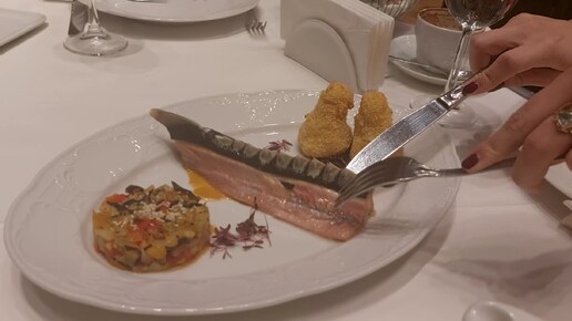 Для копченой стерлядки в ресторане ЦДЛ берут только некрупную рыбу и подают ее с теплым грибным рагу и картофельными крокетами в форме груш