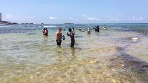 кормят черепах из рук прямо в воде на пляже Шри-Ланка