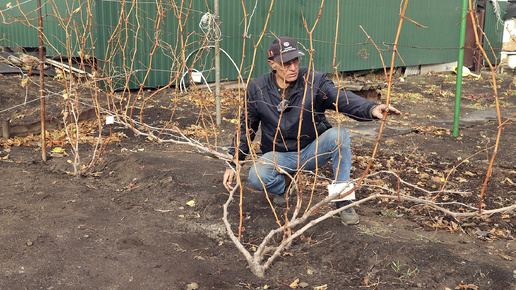 Осенняя обрезка взрослых кустов винограда на одноплоскостной шпалере