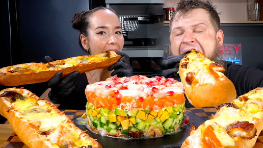 МЕТРОВЫЕ БУТЕРБРОДЫ С РЫБОЙ И СЫРОМ И САЛАТ С ЛОСОСЕМ, ГОТОВКА И ПОЕДАНИЕ, ASMR MUKBANG, АСМР МУКБАНГ