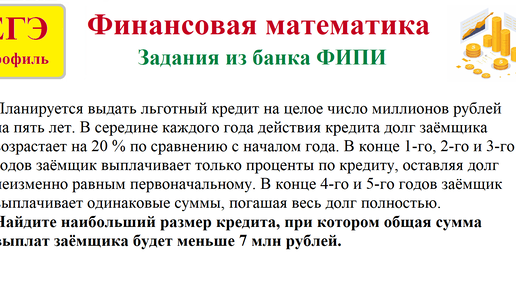 Финансовая математика. Экономическая задача из банка ФИПИ.