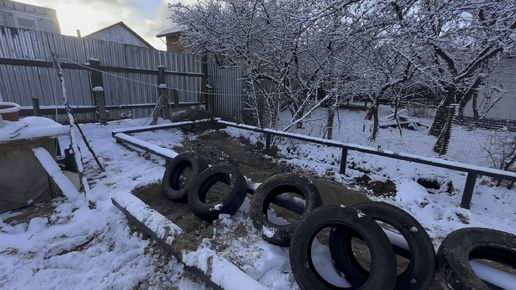 Первый снег. Готовлю свайный фундамент у зиме. Утилизирую старые шины