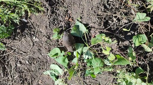 Деревня. Ручная серая мышка на огороде