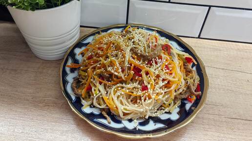 Горячая фунчоза с мясом и овощами. Лёгкий, вкусный и простой вариант тёплого салата с рисовой лапшой. Прекрасная идеч лёгкого ужина.