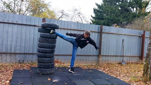 Тренировка - выбить ударами две, три шины подряд из пирамиды.