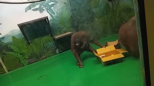 Показательно кормление борнейских орангутанов пятнадцатилетний Мишель и двадцатипятилетнего Бату в Новосибирском зоопарке